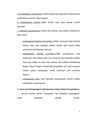 Sadono Sukirno 2000 membedakan pengangguran kedalam beberapa jenis yaitu. Pengangguran ini disebut juga sebagai open unemployment merupakan tenaga kerja yang benar-benar tidak memiliki pekerjaan atau sama sekali tidak bekerja. Pengangguran terbuka adalah pengangguran yang terjadi karena lowongan pekerjaan yang lebih rendah dan pertambahan tenaga kerja.