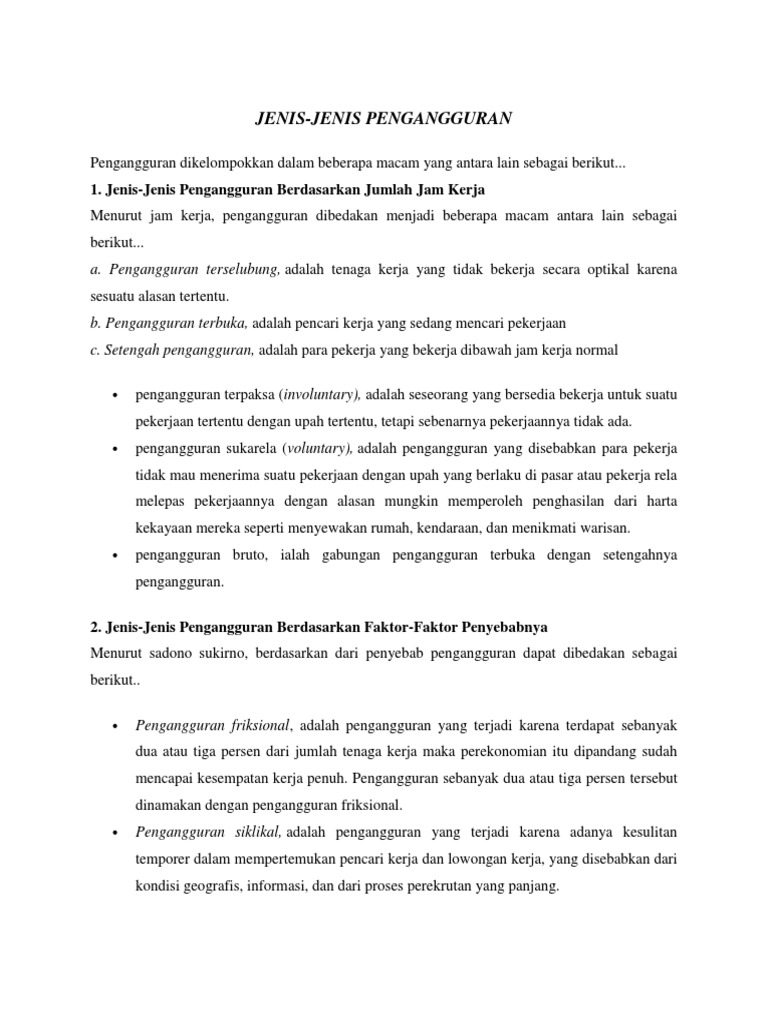 Pengangguran ini terjadi karena tidak tersedianya lapangan kerja atau karena. Pengangguran tersembunyi adalah pengangguran yang terjadi karena kelebihan tenaga kerja yang. Berdasarkan ciri-cirinya pengangguran dikelompokan sebagai berikut.